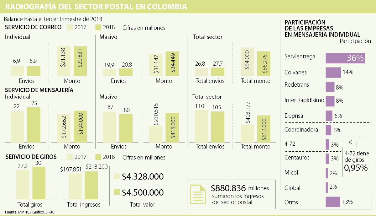 En correos, aunque las cifras del tercer trimestre de 2018 cayeron frente a las del mismo periodo de 2017, 4-72 todavía es responsable de 27,7 millones de envíos que representaron $55.278 millones.