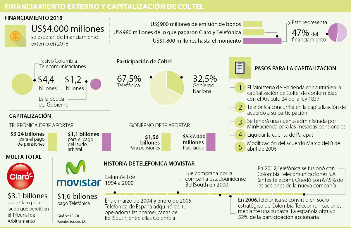 El Ministro de Hacienda sostuvo que el Ministerio de las TIC tendrá en sus cuentas $536.000 millones, los cuales pasarán al Ministerio de Hacienda con el fin de pagar la parte que corresponde para la capitalización de Colombia Telecomunicaciones (Coltel), la cual fue aprobada el martes y que sería por $6,4 billones, en donde el Gobierno tiene una participación de 32,5% y Telefónica de 67,5%. “Entonces sí hay un pago de un Ministerio a otro Ministerio, es algo neutro, es dentro del mismo Gobierno que se hace la transacción”, puntualizó Cárdenas.