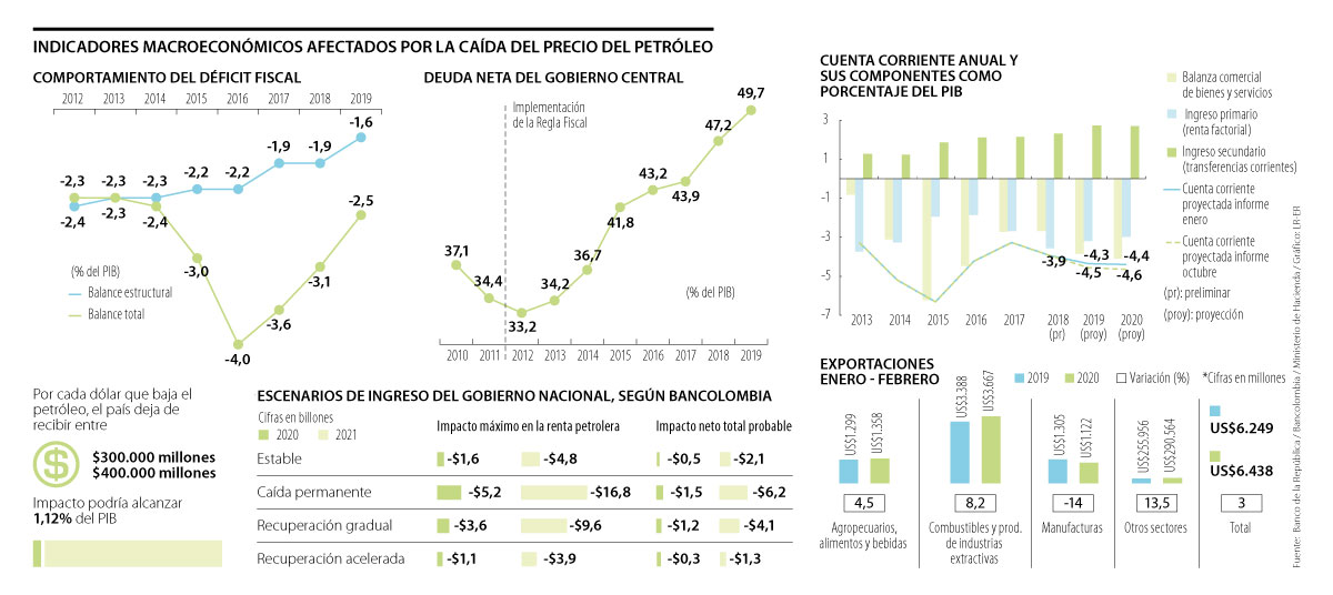 De ese modo, economistas y autoridades coinciden en que las cuentas fiscales se verán afectadas, y lo que mantiene la incertidumbre ahora es sobre cuál será su magnitud. Al respecto cabe recordar que en febrero de este año, cuando el ministro de Hacienda, Alberto Carrasquilla expuso el Plan Financiero de 2020, se esperaba que, en promedio, el barril de Brent estuviera costando US$60,5, es decir, US$41,4 más que lo que costaba ayer.