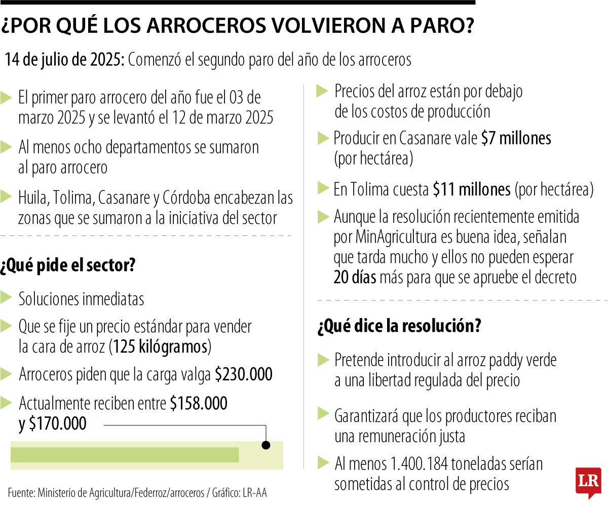 En marzo de este año, el sector ya realizó un paro de nueve días y aunque se firmó una hoja de ruta con el Gobierno, los acuerdos no se cumplieron, lo que llevó a la nueva protesta. Los arroceros insisten en que la crisis va más allá de los precios y reclaman inversión estatal en distritos de riego para asegurar la producción durante todo el año. También piden el retorno del incentivo por almacenamiento, que les permita guardar el cereal en meses de baja producción.