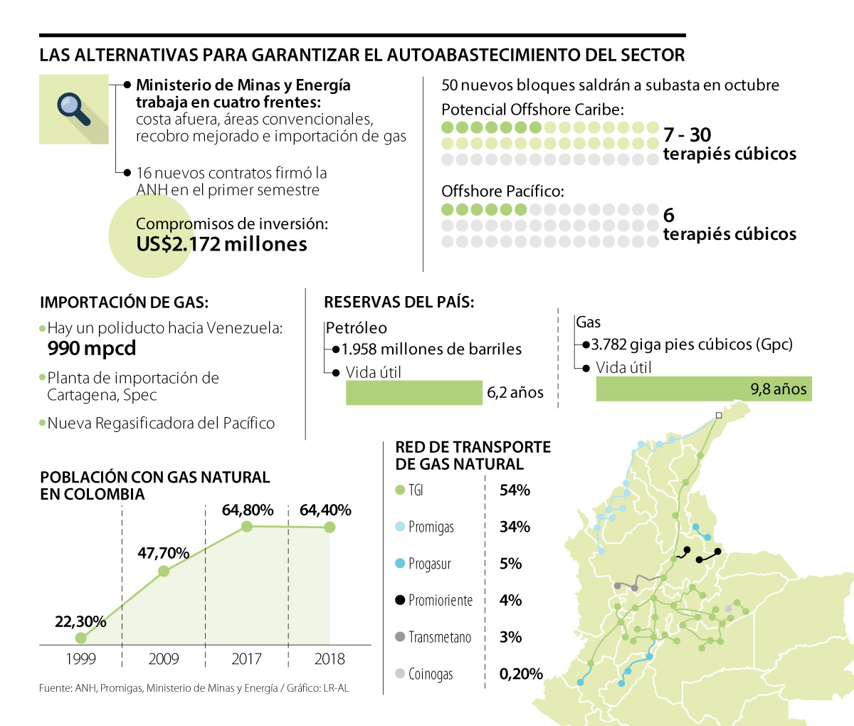 Según las cifras oficiales, Colombia pasó el año pasado de tener 11,7 años de autosuficiencia en gas a 9,8 años (3.782 giga pies cúbicos), mientras que las reservas de petróleo pasaron de 5,7 años a 6,2 años, al subir en 2018 a 1.958 millones de barriles.