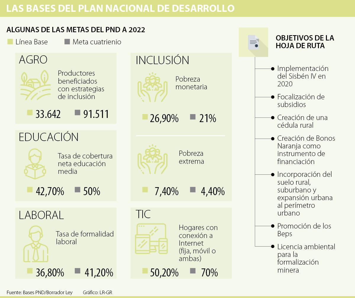 La propuesta de la hoja de ruta para el cuatrienio del Gobierno de Iván Duque, que se radicará hoy en el Congreso, pretende retomar la senda del crecimiento económico del país a través de proposiciones como la creación de una cédula rural que ayude a formalizar la actividad agropecuaria; la implementación del Sisbén 4.0, que permita focalizar los programas sociales; o el fomento de las actividades de la denominada economía naranja que ayude a solucionar los desafíos productivos y de empleo del país.