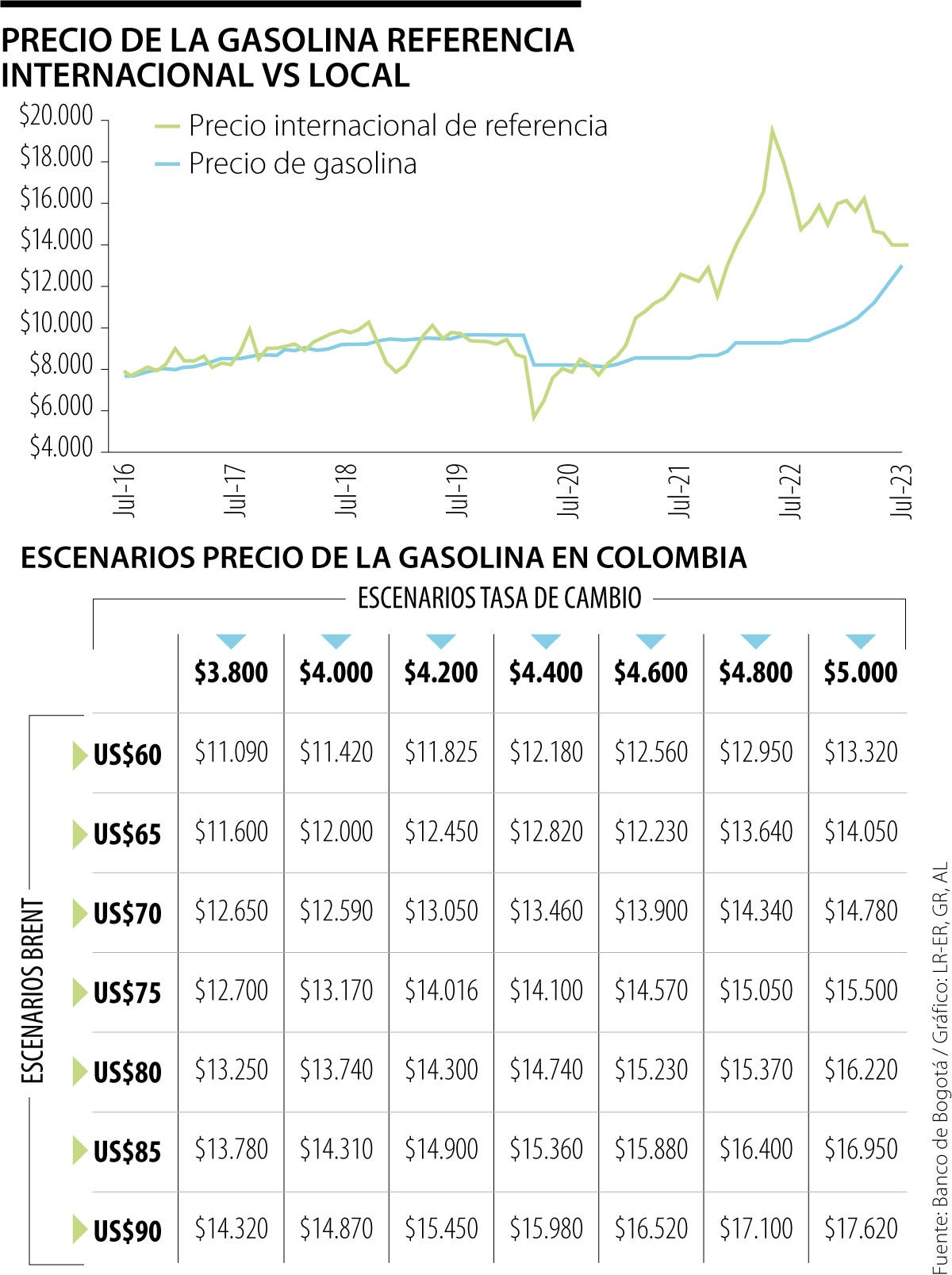Así lo explicó Camilo Pérez, gerente de Investigaciones Económicas del Banco de Bogotá, quien dijo que “hace un tiempo, la conversión del precio internacional a pesos colombianos daba niveles cercanos a $16.000. Sin embargo, recientemente hemos visto una caída del precio internacional y una apreciación de la tasa de cambio. Al hacer la conversión del precio de la gasolina a una tasa de referencia más baja, el referente que tenemos ahora es menor. Por eso estimamos que el precio de equilibrio hoy en día está cerca a los $14.000”.