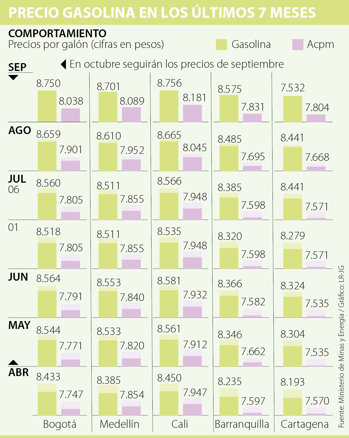 De acuerdo con el Ministerio de Minas y Energía, para octubre no habrá una variación en las tarifas de los combustibles, lo que quiere decir que continúan los precios de referencia de la gasolina y el Acpm de septiembre. Para Bogotá queda en $8.750 y $8.038; Medellín, $8.701 y $8.089; y Cali, $8.756 y $8.181.