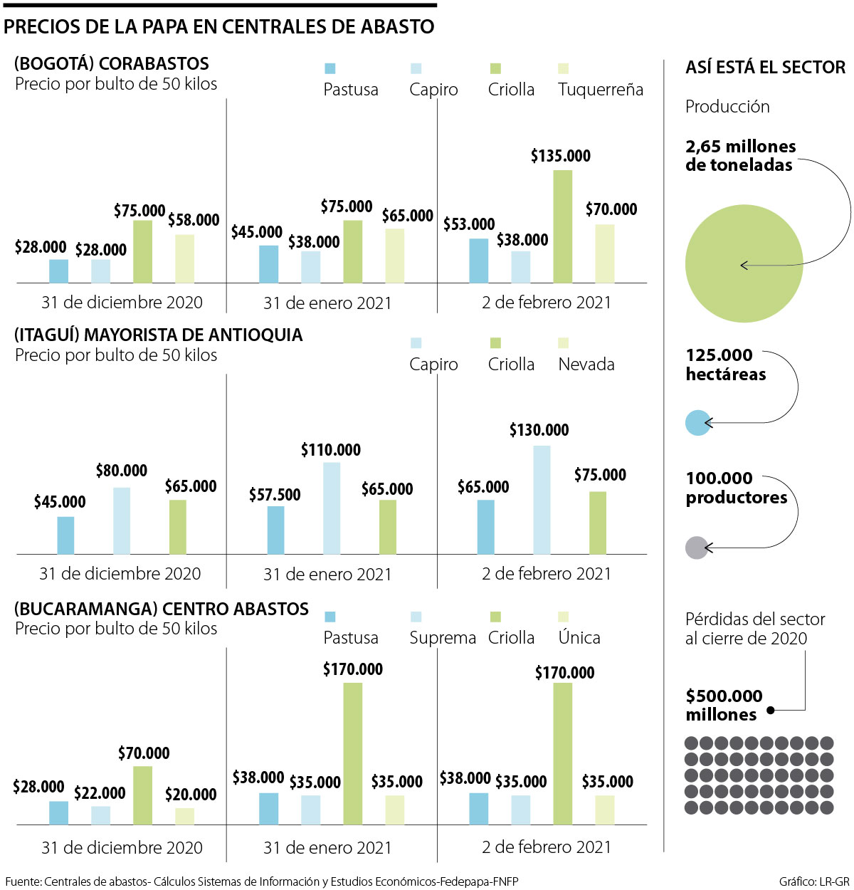 En el caso de la capital del país hubo importantes movimientos en los precios, especialmente en la papa criolla que subió 80% (entre el 31 de diciembre y el 2 de febrero de 2021). Pasó de $75.000 el bulto a $135.000. Mientras tanto, el 31 de enero el precio se mantuvo igual que al cierre del año pasado en $75.000.