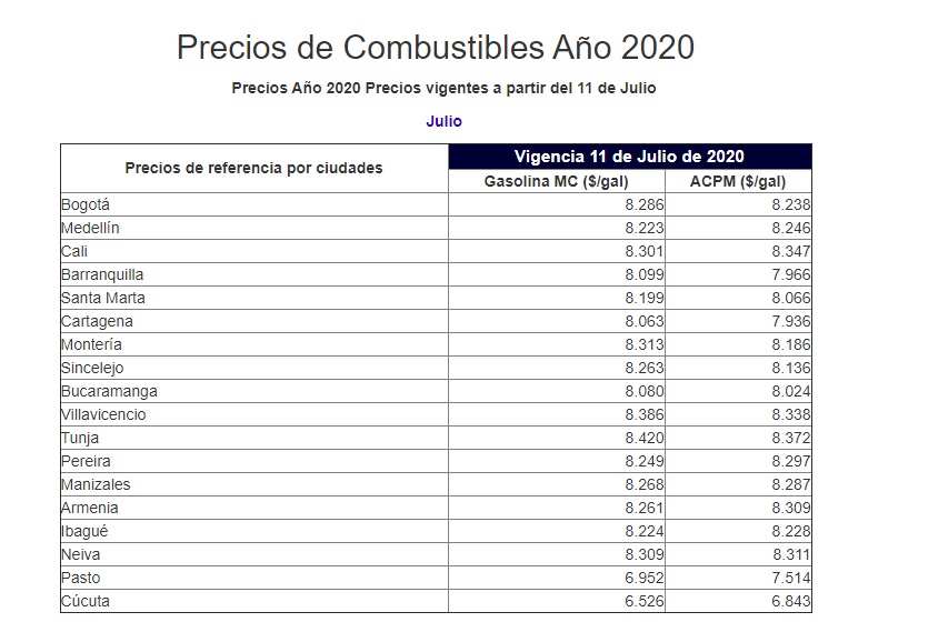 De acuerdo con el Ministerio de Minas y Energías, el precio del diésel bajará $117 por galón en promedio en las 13 principales ciudades del país para julio, mientras que el precio de la gasolina se mantendrá estable en la mayor parte del territorio nacional, incluida Bogotá.