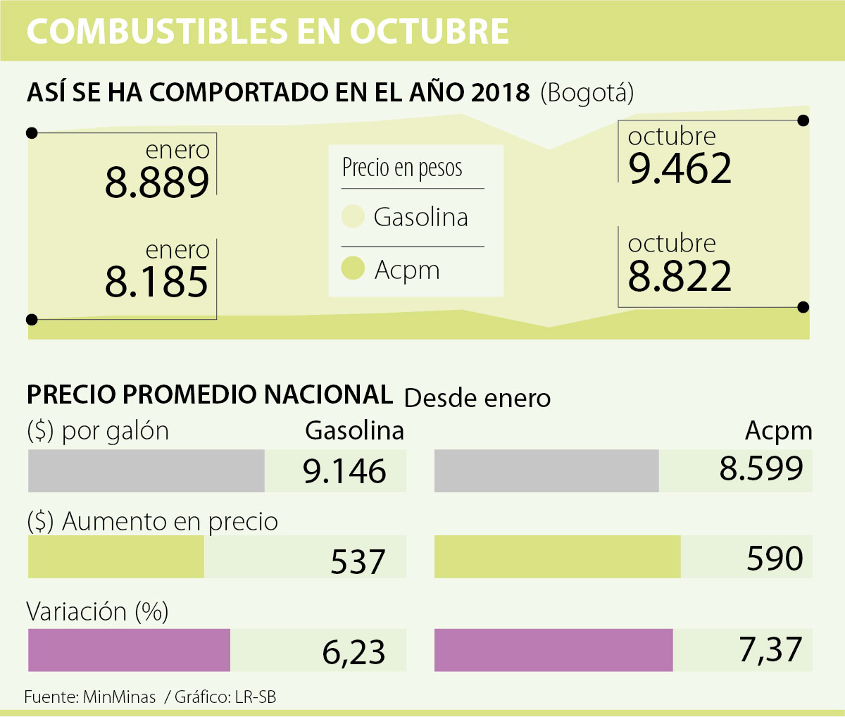 Desde el fin de semana, el Ministerio de Minas y Energía dio a conocer el nuevo incremento en los combustibles en el país, con lo que el precio de referencia para el galón de gasolina en Bogotá quedó en $9.462, lo que representó un alza de $123, mientras que para el Acpm el aumento fue de $107, con lo que el precio llegó a los $8.822 por galón.