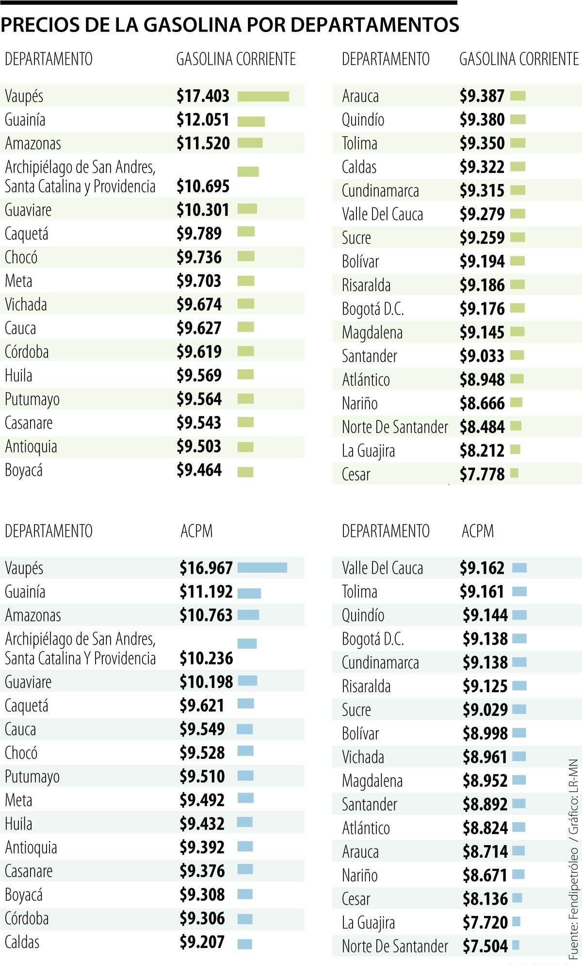 Cifras del Fondo Soldicom-Fendipetróleo en su último reporte muestran que Vaupés y Guainía son los departamentos con el precio más alto de la gasolina $17.403 y $12.051 el galón de corriente, respectivamente. Seguidos por Amazonas ($11.520), San Andrés y Providencia ($10.695), Guaviare ($10.301), Caquetá ($9.789), Chocó ($9.736) y Meta ($9.703).