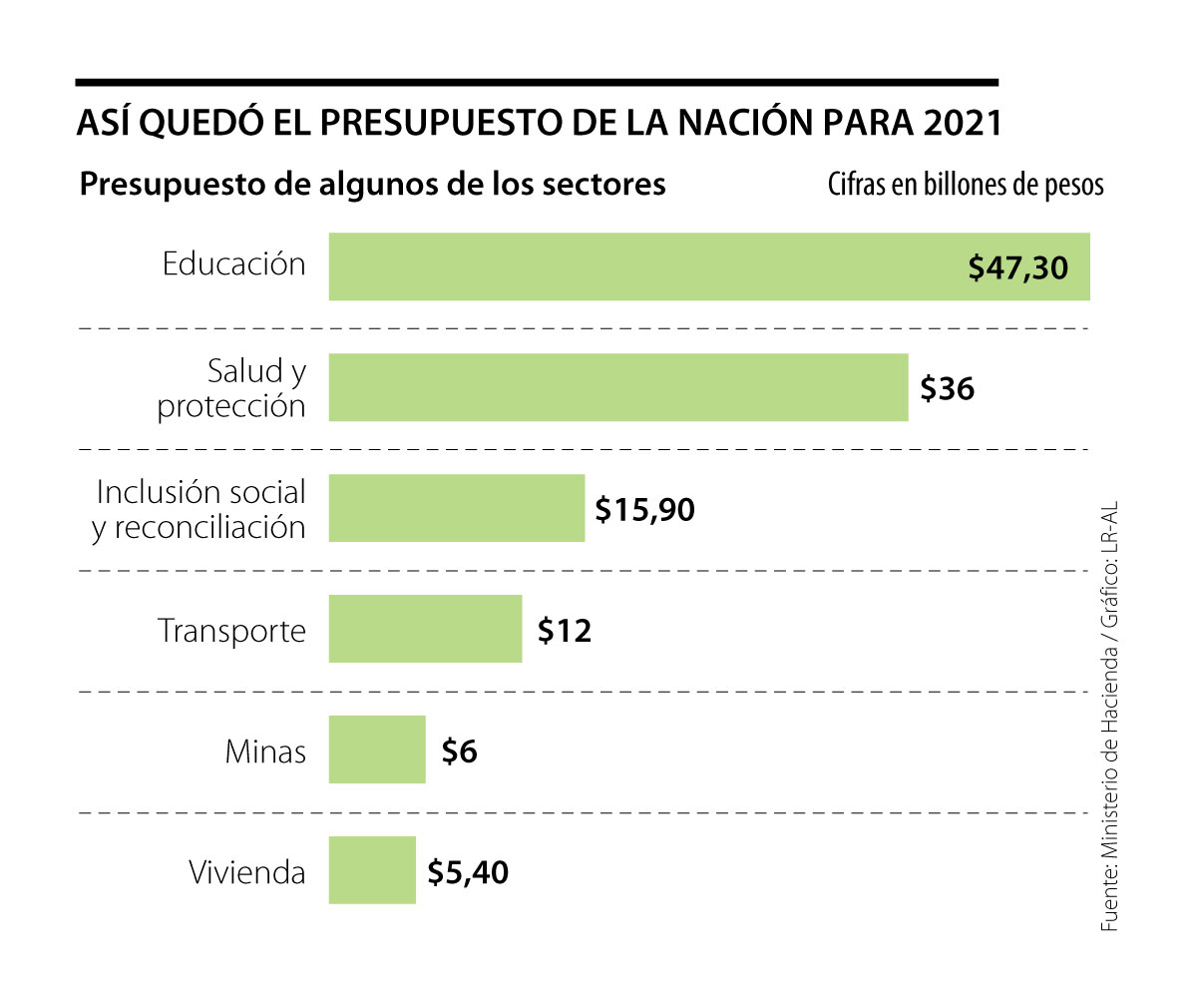 El sector que contará con mayor presupuesto el próximo año será educación, con $47,3 billones, que representan un aumento de 7,9% frente a lo aprobado para este año. Le sigue salud, que tendrá una asignación de $36,05 billones (16,6% más que en 2020), y el de trabajo, que contará con $27,2 billones.