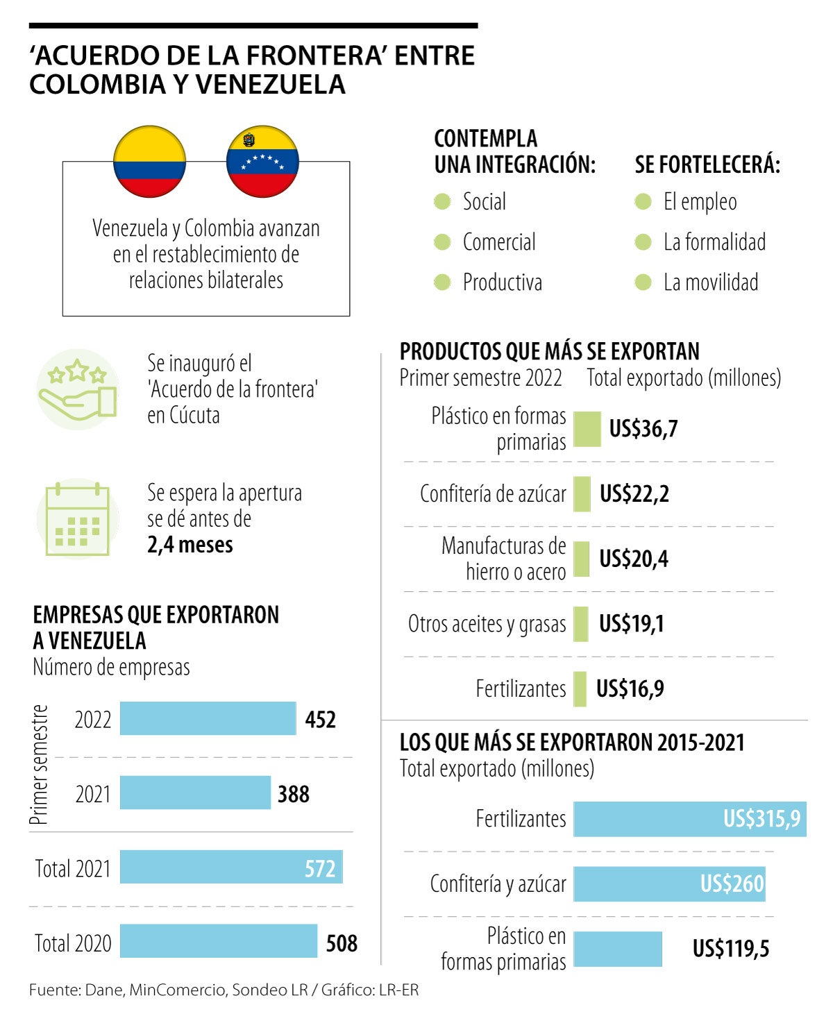 Si bien, el ministro de Comercio, Germán Umaña, había previsto durante el acto del 'Acuerdo de la Frontera' que la apertura se haría en noviembre, el avance de las conversaciones y las peticiones de ciudadanos y comerciales redujo los tiempos. Se prevé que con la apertura comercial el país podría percibir hasta US$6.500 millones en exportaciones.