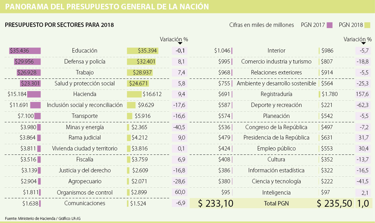 Así como el PGN le quitaría $7,5 billones a 17 sectores, también le va a agregar $10,3 billones a 12 ramas de actividad. De acuerdo con el proyecto del Presupuesto, los mayores incrementos estarían en defensa y policía con $2,4 billones; trabajo con $2 billones; hacienda con $1,4 billones y salud y protección con $1,3 billones. Vivienda e inteligencia solo aumentarían $5.000 y $2.000 millones los montos para ejecutar en 2018.