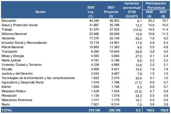 El proyecto, sin deuda, asciende a $238,1 billones, de los cuales $53,1 billones corresponden a inversión y $185 billones a funcionamiento. Según el Ministerio de Hacienda, este PGN representa un incremento de 13,5% frente al presupuesto de 2020.