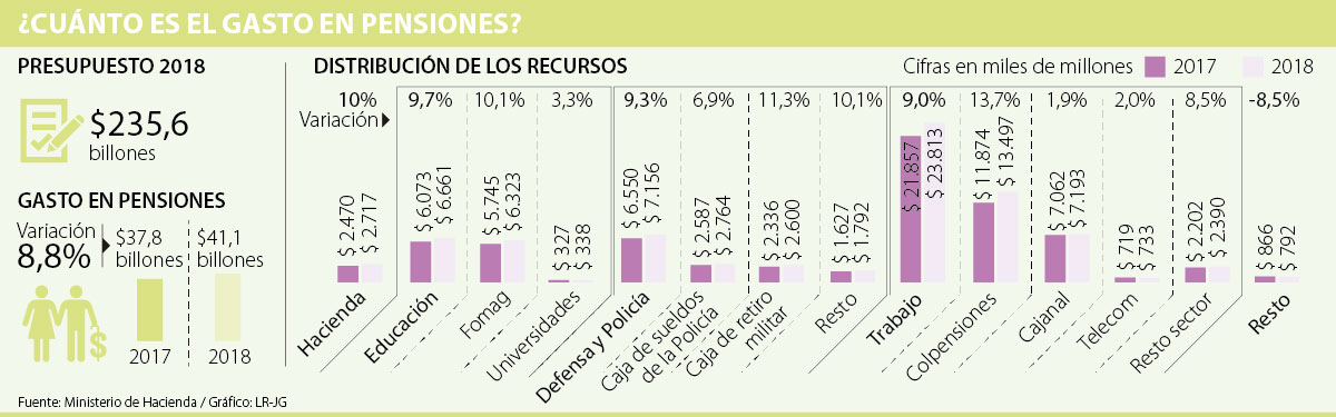 Por el momento, el proyecto plantea que en el pago de pensiones, uno de los puntos que más se ha generado debate en los últimos años por los altos costos, va a destinar $41,1 billones. Esto generaría un incremento de 8,8% respecto a 2017, cuando aprobaron recursos por $37,8 billones en este campo.