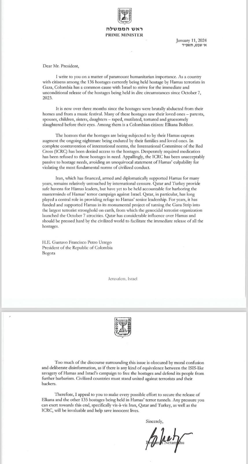 El primer ministro de Israel, Benjamín Netanyahu, envió una carta al mandatario Gustavo Petro pidiendo que realice "todos los esfuerzos posibles” para conseguir la liberación de los civiles secuestrados por la organización terrorista Hamas.