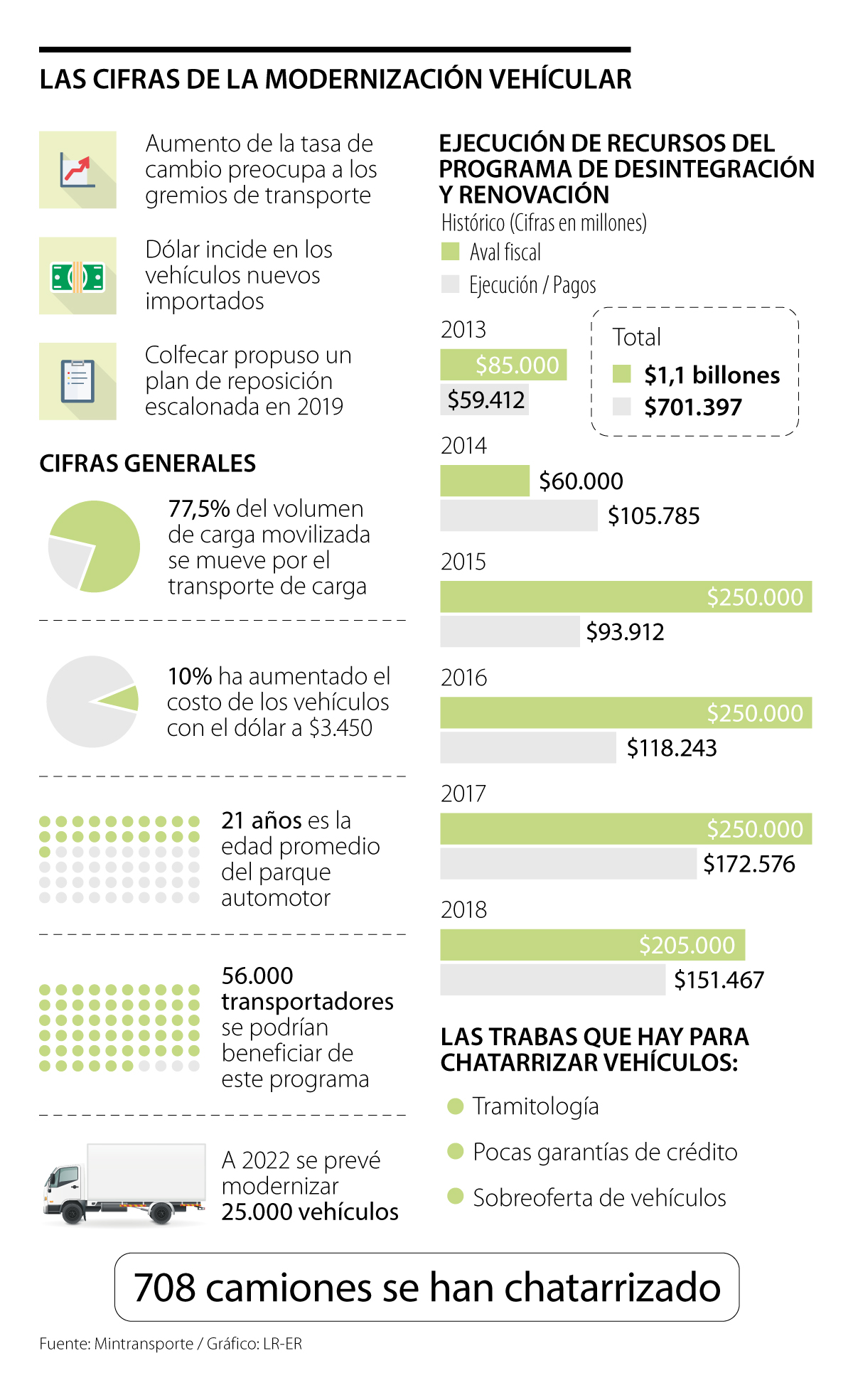 A este panorama se suma que el acceso a los créditos, según los transportadores, es difícil. “A un empresario mediano le cobran un interés muy alto. Si no tenemos un acceso a un crédito con buenas tasas es muy difícil hacerlo. Ese es otro de los cuellos de botella que padece el programa”, destacó Arnulfo Cuervo, vicepresidente de Fedetranscarga.