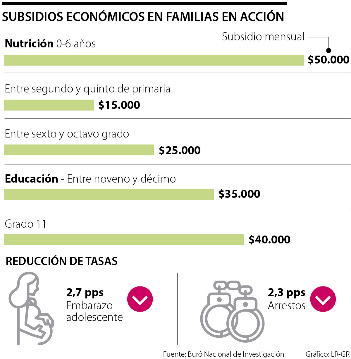 La Oficina Nacional de Investigación Económica (Nber) dio a conocer un informe en el que señala que Familias en Acción, programa de transferencias monetarias condicionadas del Gobierno Nacional, condujo a una reducción en las tasas de arrestos de 2,7 puntos porcentuales para los hombres y una reducción del embarazo en la adolescencia de 2,3 puntos porcentuales para las mujeres. En la deserción escolar , las tasas se redujeron en 5,8 pps. y hubo un incremento en el dato de matricula universitaria.