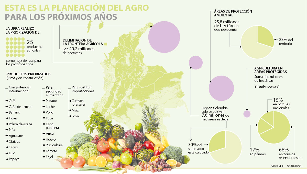 El trabajo fue realizado por la Unidad de Planificación Rural Agropecuaria (Upra), la cual ordenó las zonas con mayor aptitud en los departamentos para estos productos, además de separarlos en tres grandes ramas, según su vocación.