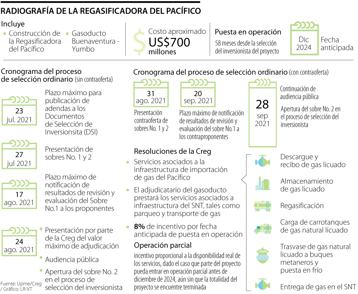 Cabe recordar que la infraestructura, según la convocatoria publicada por la Unidad de Planeación Minero Energética (Upme), se compone de la planta Regasificadora del Pacífico, ubicada en Buenaventura, y un gasoducto entre esta y un punto de entrega al Sistema Nacional de Transporte (SNT) en Yumbo, con una inversión total estimada en US$700 millones.
