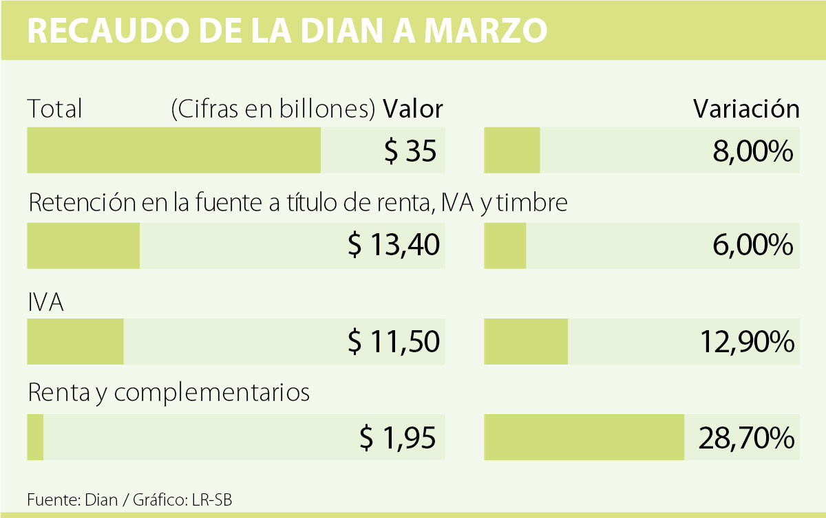 A marzo de 2018, el recaudo bruto acumulado de impuestos administrados por la Dirección de Impuestos y Aduanas Nacionales (Dian) alcanzó $35 billones, lo que representó un aumento de 8% respecto al mismo trimestre del año anterior.