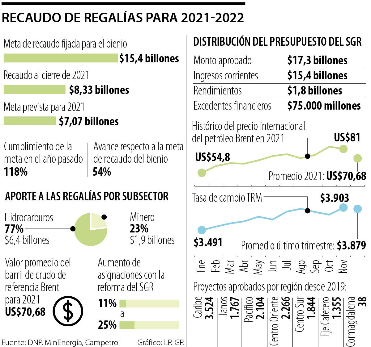 Para 2021, el Ministerio e Minas y Energía reveló que el recaudo de regalías por parte de las empresas del sector minero-energético ascendió a $8,33 billones, lo que representa un aumento de $1,26 billones si se compara con la meta establecida de $7,07 billones en el año.