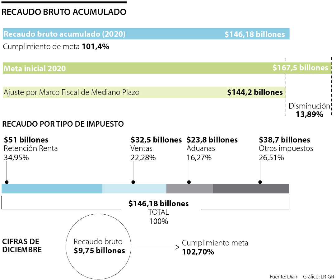 El recaudo bruto acumulado en 2020 de los impuestos administrados por la Dirección de Impuestos y Aduanas Nacionales (Dian) fue de $146,18 billones, lo que representa una caída de 7,4% frente a lo logrado en 2019, cuando se alcanzó la suma de $157,87 billones. Pese al bajo monto, se destaca la leve disminución y el cumplimiento de la meta asignada, luego del ajuste como resultado del Marco Fiscal de mediano plazo, fue de 101,4%.