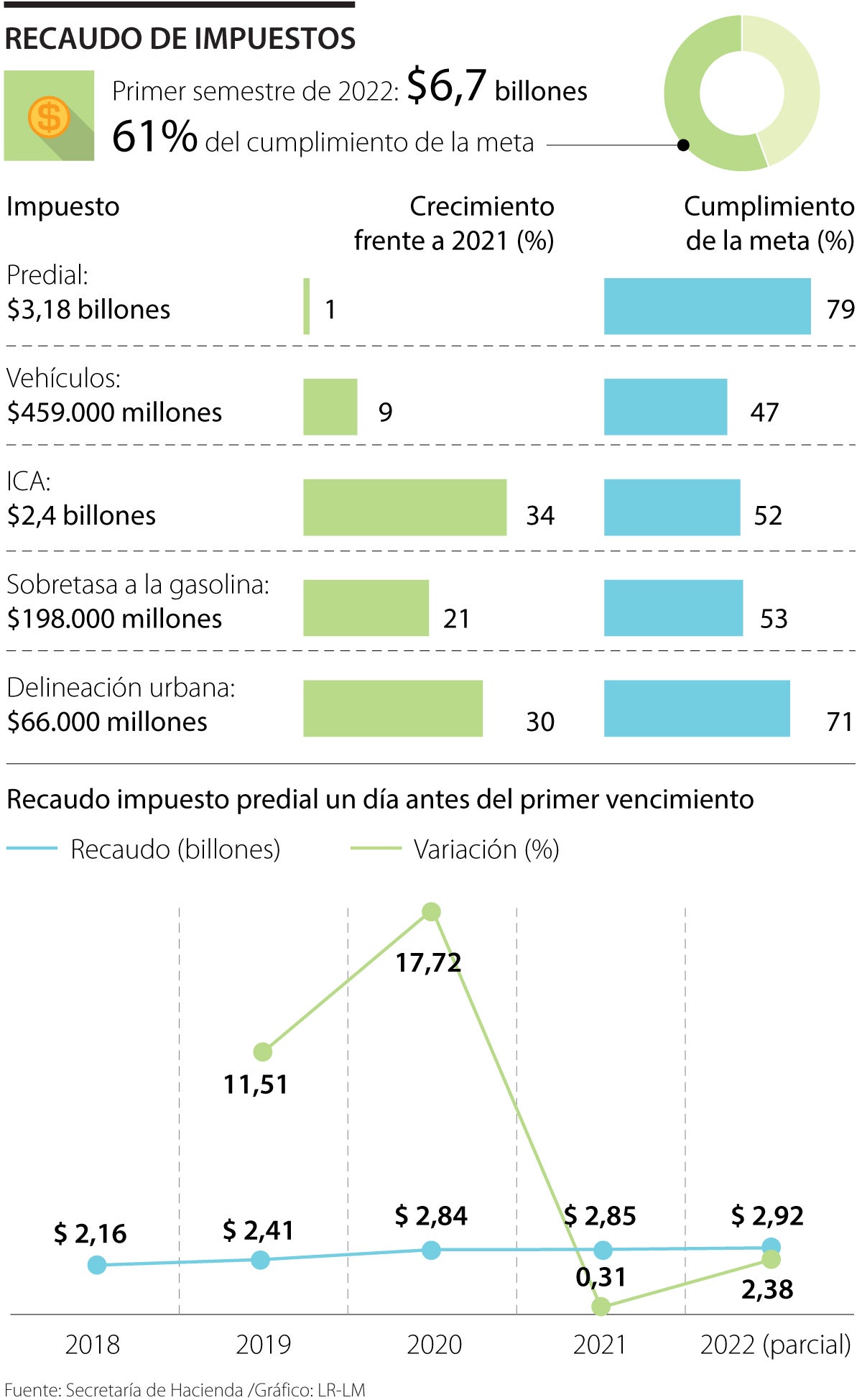 El secretario de Hacienda, Juan Mauricio Ramírez, afirmó que el desglose de impuestos arroja que $3,18 billones corresponden al predial, cifra que significa 79% de la meta del año que son $4 billones. El pago de esta obligación tributaria creció 1% frente al año pasado.