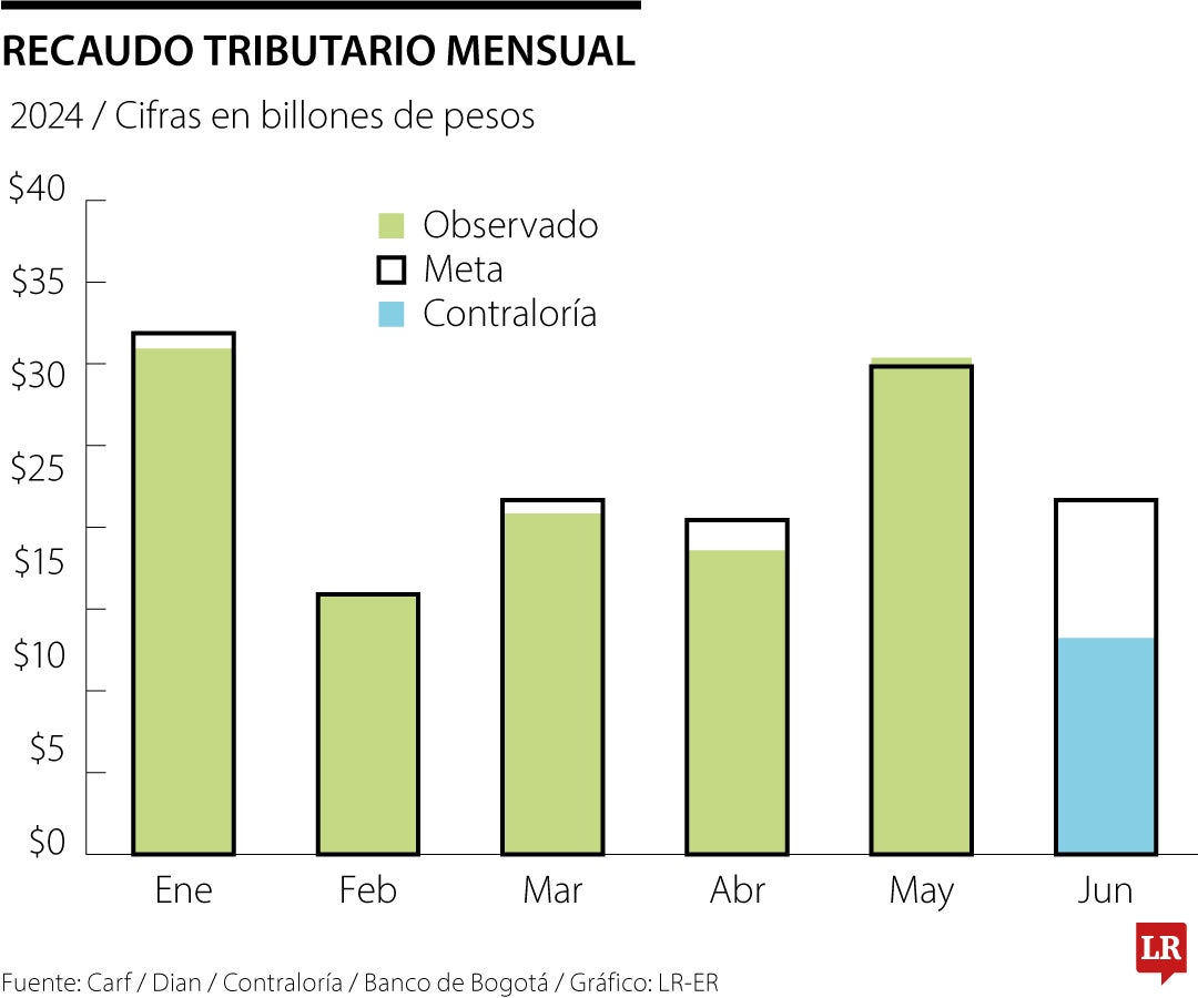 El informe basado en un reporte de la Contraloría advirtió que el recaudo en el primer semestre fue de $129 billones; es decir, $12 billones por debajo de la meta del Gobierno y 19,8% menos frente a 2023, “siendo esta la caída anual más pronunciada en lo corrido del siglo XXI”.