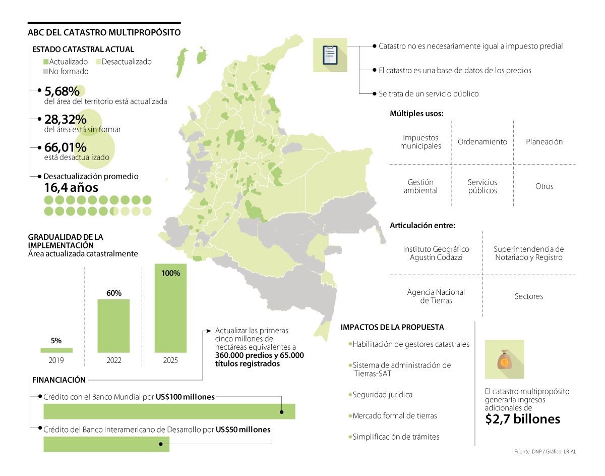 Hoy en día tan solo 5,68% del área del país cuenta con un catastro actualizado y de llegar a saber quién es el propietario de todos los predios del país, meta que se espera cumplir en 2025, los municipios podrían elevar sus recaudos sin necesidad de crear nuevos tributos.