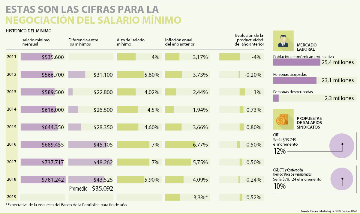 Hasta el momento, en las negociaciones para acordar el mínimo de 2019, solo se han conocido las propuestas de la CUT, que pidió un aumento de 12%, y de la Confederación General del Trabajo (CGT), que junto con la Confederación de Trabajadores de Colombia (CTC) y la Confederación Democrática de Pensionados solicitó un incremento de 10%.