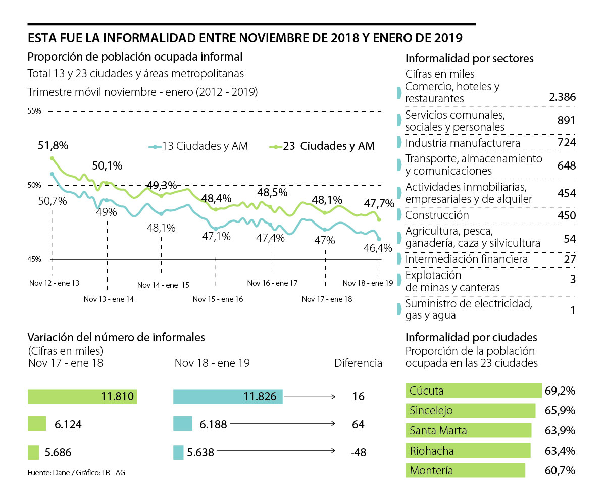 En el trimestre móvil entre noviembre de 2018 y enero de 2019, según el Dane, el número de personas informales en las 23 ciudades llegó a 5,6 millones.