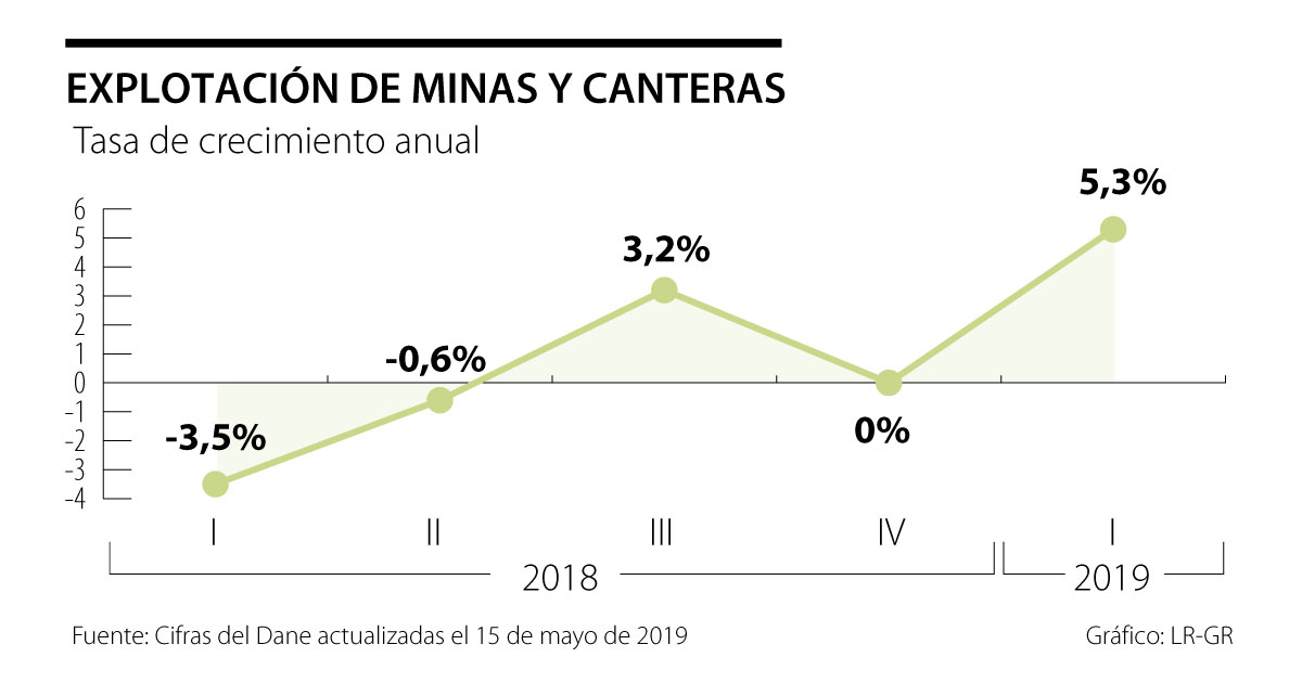 Luego de una expansión de 5,3% en el primer trimestre, la rama de la explotación de minas y canteras podría tener resultados mixtos debido a una producción de carbón que se ha visto mermada por la reducción en los precios internacionales y por el incremento de oro. Además, se ha visto una mayor producción de las esmeraldas.