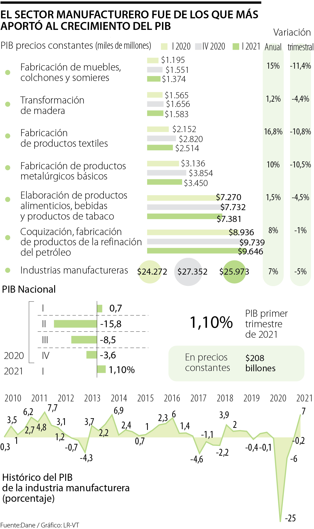 Las industrias manufactureras fueron de las actividades que más aportaron al resultado final, pues contribuyeron 0,9 puntos al crecimiento anual de la economía nacional y crecieron 7% frente al mismo trimestre de 2020. El sector generó $25,97 billones en el trimestre.