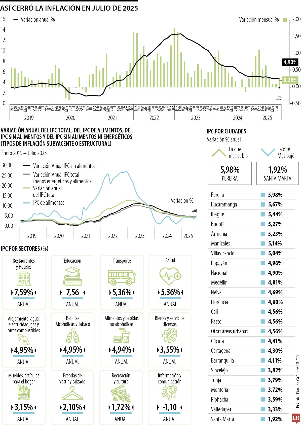 El Departamento Administrativo Nacional de Estadística, Dane, informó que la inflación anual para julio de 2025 se ubicó en 4,90%, lo que representa un ligero repunte en comparación con el dato de junio, cuando se ubicó en 4,82%. Según la entidad, el rubro de alimentos y bebidas no alcohólicas, junto con alojamiento y restaurantes, son las que más jalonaron el dato en el séptimo mes del año. Piedad Urdinola, directora del Dane, destacó que este comportamiento del IPC no se observaba desde julio de 2021.