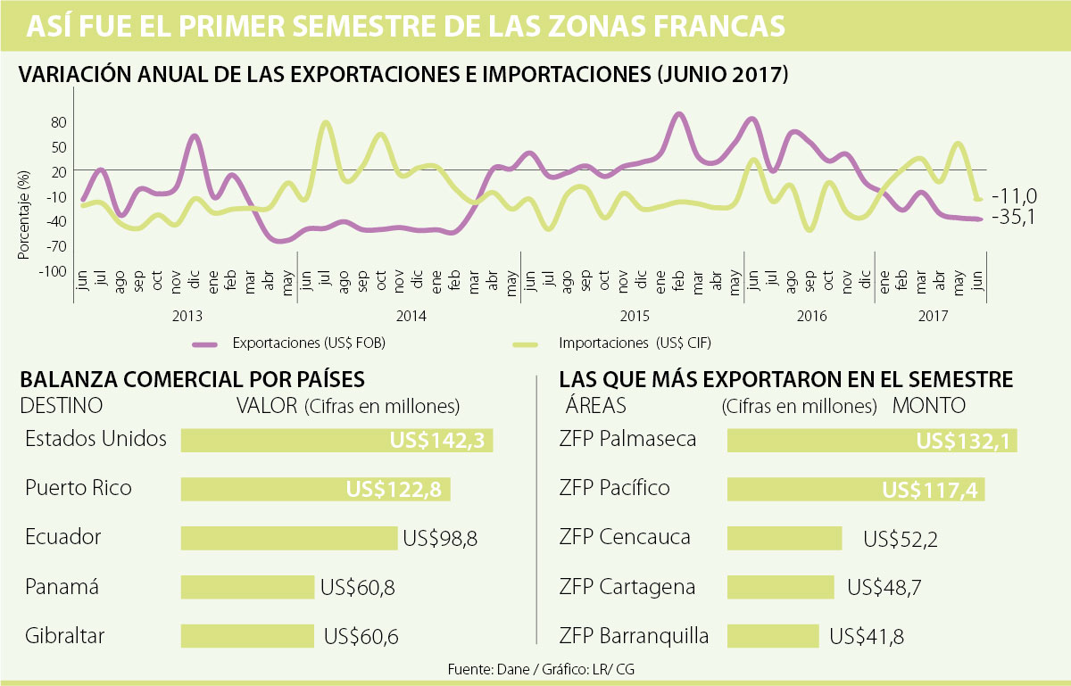 A pesar de la promoción que desde el Gobierno se le ha hecho a las zonas francas, estas herramientas comerciales no han tenido un buen 2017, si se tiene en cuenta que en el primer semestre su superávit solo logró US$3,9 millones, mientras que en el mismo periodo del año pasado la cifra llegó a US$522,7 millones.