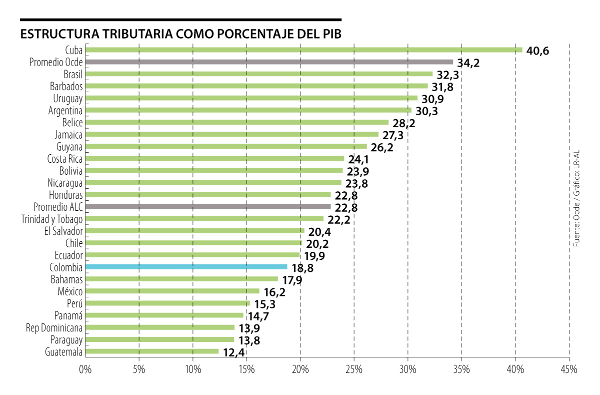 De acuerdo con el informe de la Ocde, se necesitan mayores recursos públicos para financiar el desarrollo en la región, pues mientras que la estructura tributaria como porcentaje del PIB llega a 34% en el promedio de los países de la organización, en América Latina solamente alcanza 22,8% y en Colombia se ubica en 18,8%.