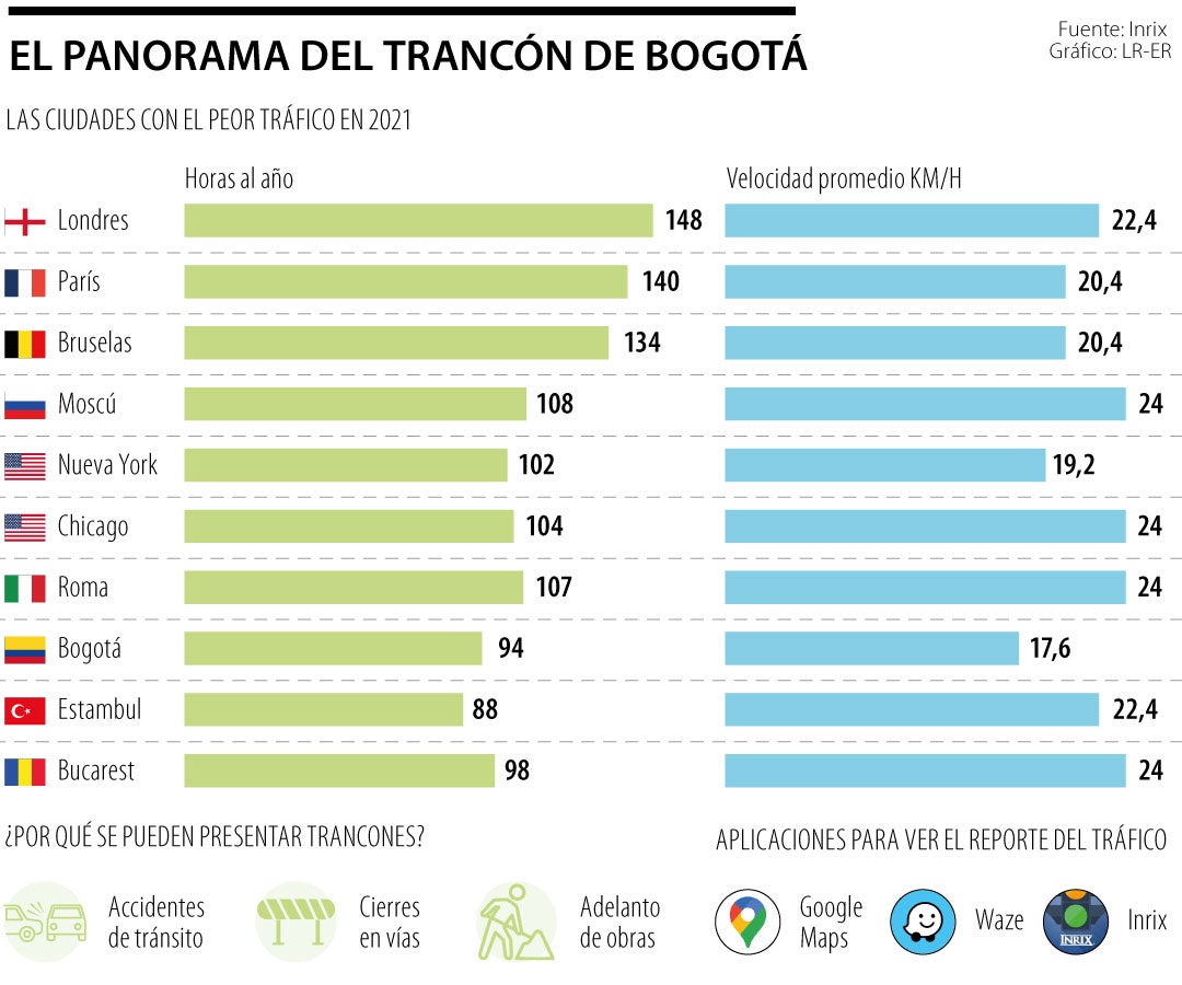 Se estima, según cifras de Inrix, que Bogotá es una de las 10 ciudades con el peor tráfico del mundo, ubicándose, para 2021, en el puesto ocho con un total de 94 horas perdidas en trancón, a una velocidad promedio de 17,6 kilómetros por hora.
