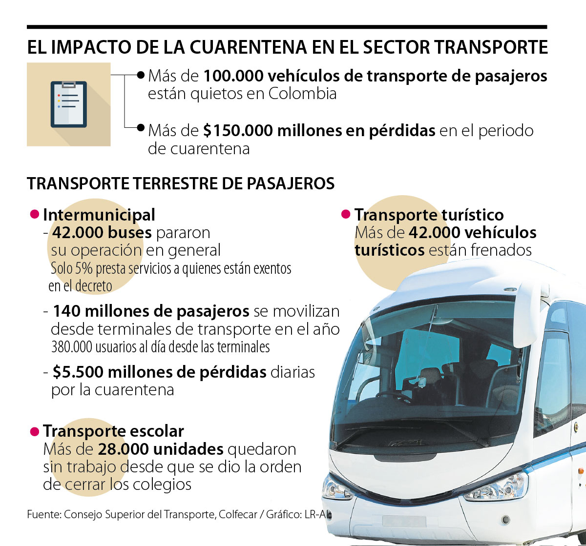 De acuerdo con el Consejo Superior del Transporte, son más de 100.000 automotores de pasajeros los que actualmente han frenado a causa de la cuarentena. De este total, según explicó Camilo García, director ejecutivo del Consejo, 42.000 buses de transporte intermunicipal han frenado, por lo que tan solo 5% son los que están prestando el servicio, principalmente a quienes están exentos del decreto del Gobierno o a profesionales de la salud.