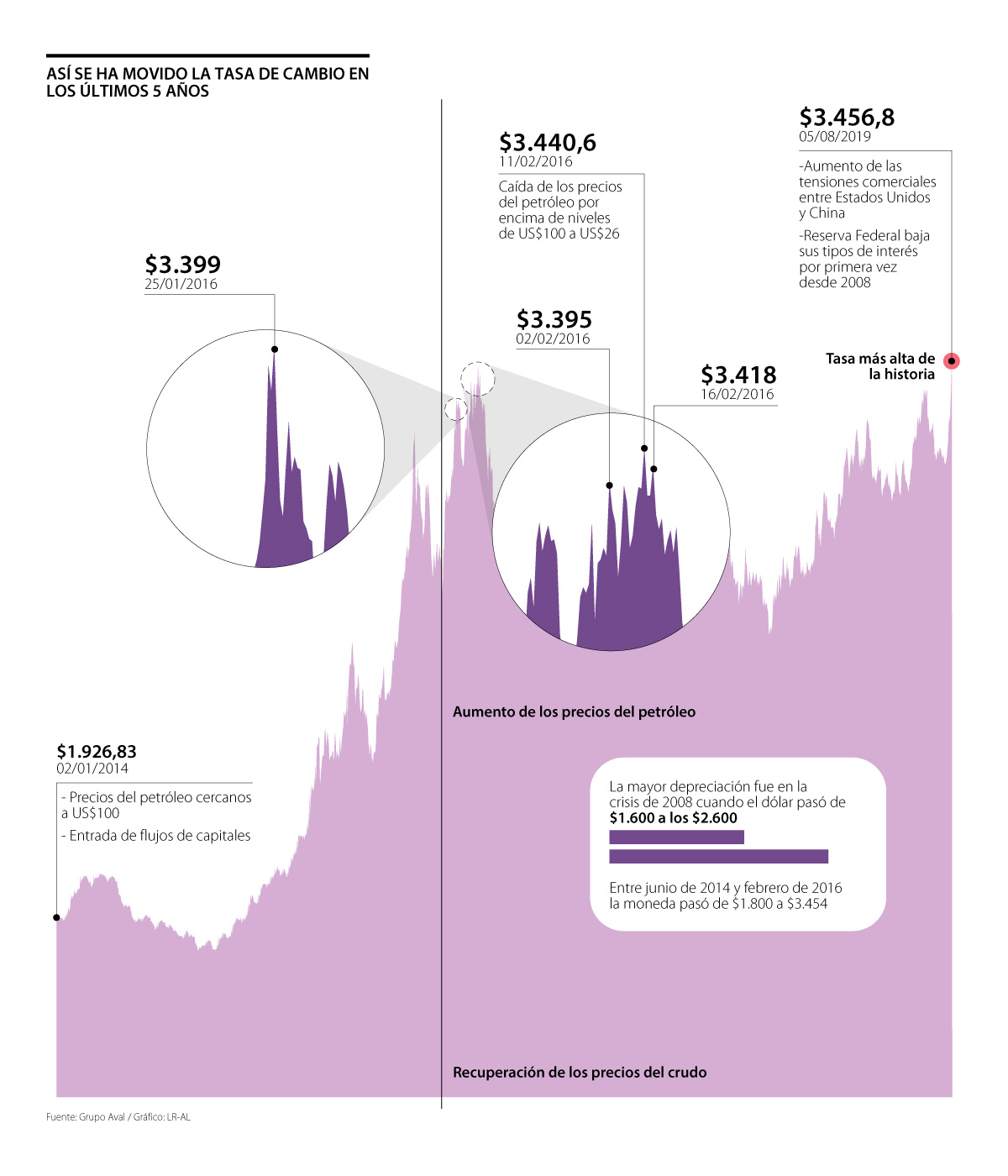 El 5 de agosto de 2019 pasará a la historia como el día en el que el dólar alcanzó su máximo histórico al llegar a $3.483 de máximo y cerrar a $3.456 debido a la unión de la escalada de la disputa comercial entre Estados Unidos y China, más la bajada de tipos de interés de la Reserva Federal por primera vez desde la crisis de 2008.