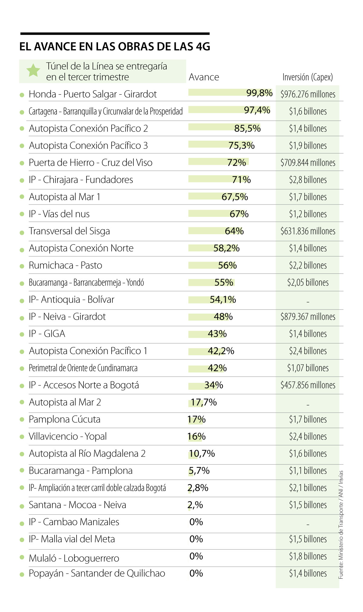 A esta se sumaría el tramo de Cartagena - Barranquilla y la Autopista Conexión Pacífico 2, los cuales, pese al impacto del covid, ya están a poco de terminar su ejecución. Mientras la primera registra un avance de 97,4%, la segunda de 85,5%.