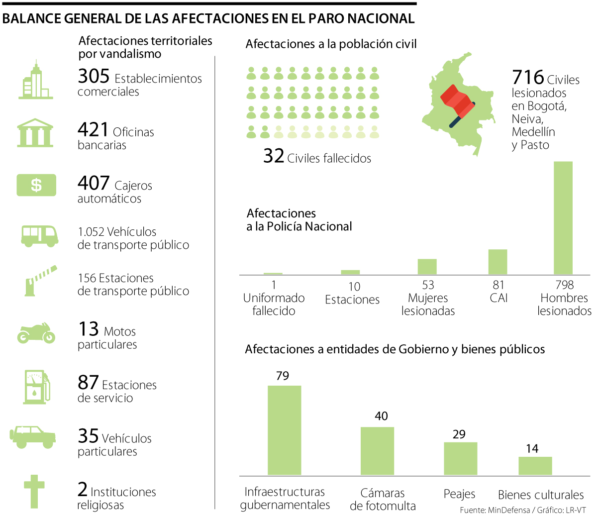 Entre las afectaciones a la población, el documento asegura que hay 32 civiles fallecidos y 716 civiles lesionados, en ciudades como Bogotá, Cali, Neiva, Medellín y Pasto, además de otros municipios de Risaralda y Valle del Cauca.