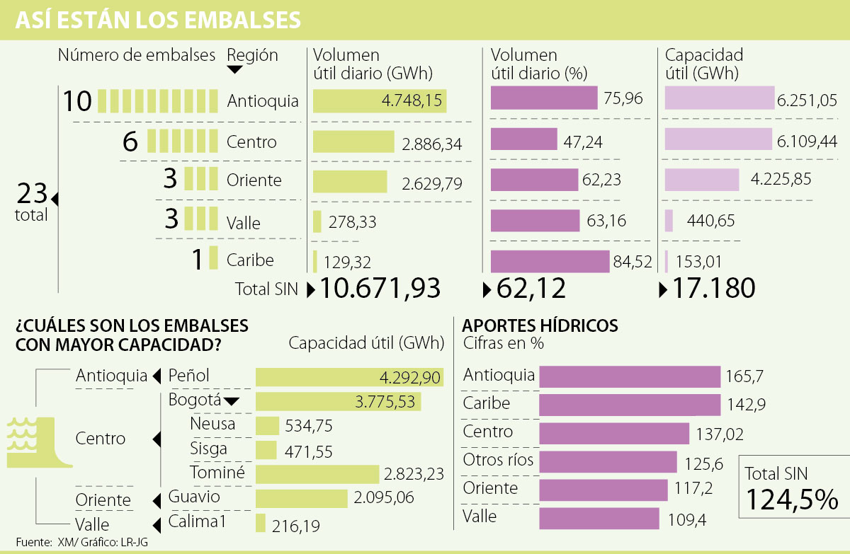Visto por regiones, el mayor volumen útil está en el Caribe con 84,52%, seguido de Antioquia con 75,96%, Valle con 63,16%, Oriente con 62,23% y la región Centro con 47,24%.