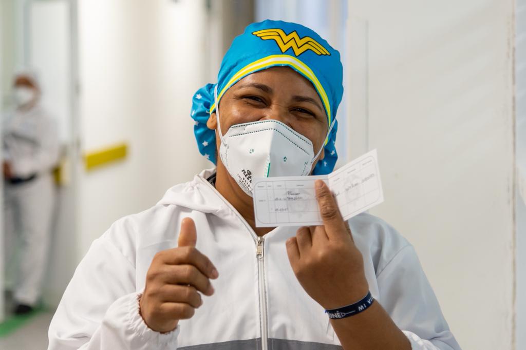 "Quiero hacerle un reconocimiento especial a Liseidis Pérez, una mujer que ha estado en la primera línea de atención del covid-19, en una tarea que es muy valerosa, que son los servicios generales en las Unidades de Cuidados Intensivos (...). Nos entusiasma que con ella empiece este proceso masivo, seguro y gratuito en esta ciudad", dijo el presidente.