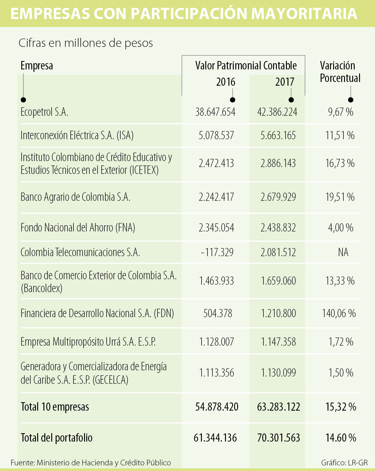 De acuerdo con el informe, la Nación tiene $70 billones invertidos en empresas de acuerdo con su valor patrimonial, 14,6% más que en 2016. Estos resultados se deberían principalmente al mayor nivel de utilidades reportadas por Ecopetrol ($6,6 billones) y a que su valor patrimonial pasó de $39 billones a $42 billones.