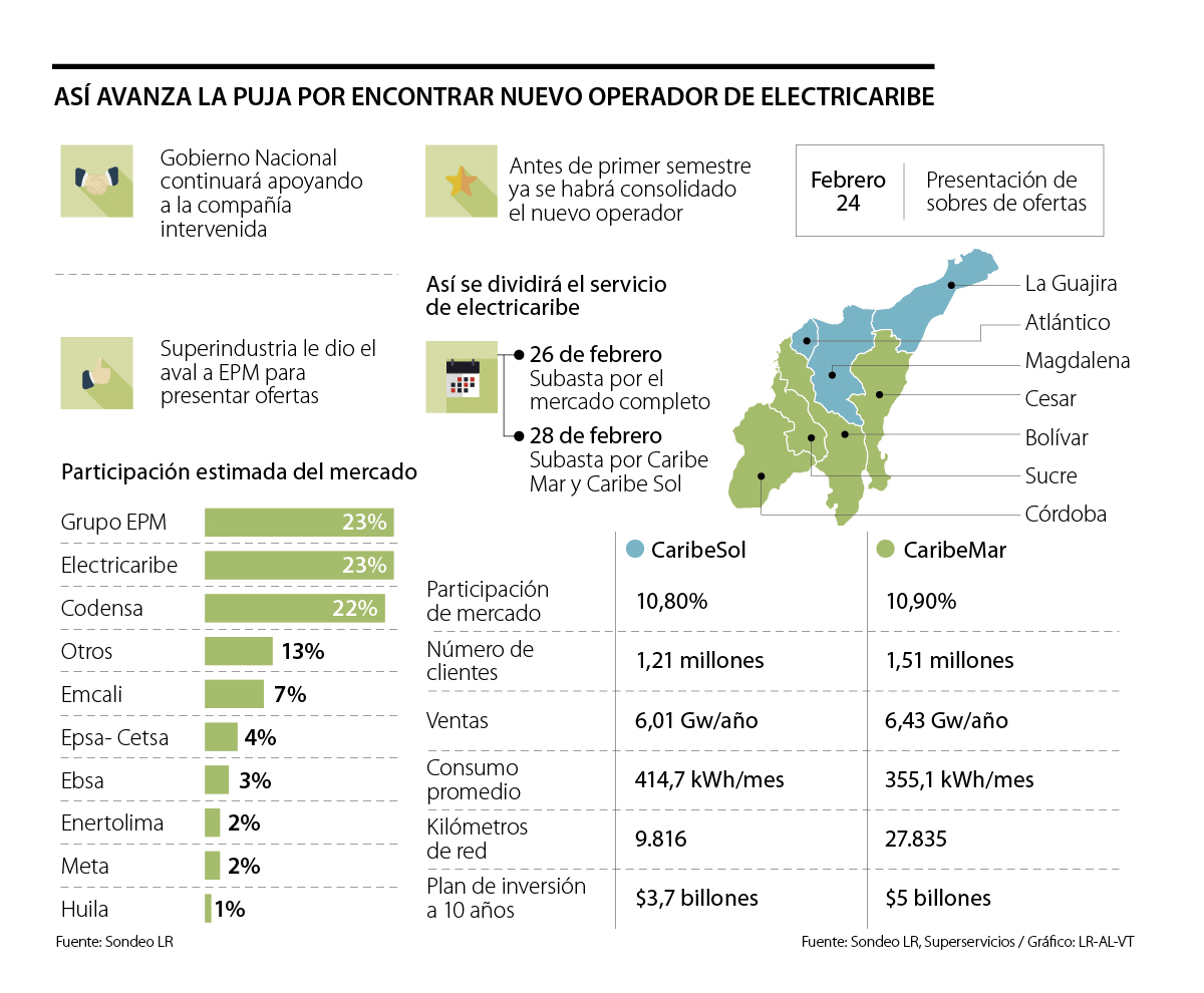 La espera para saber quién se quedará con una o con las dos partes de Electricaribe está a muy poco de acabarse. El próximo 24 de febrero el Gobierno Nacional recibirá las ofertas finales por la compañía, con lo que se dará paso a que dos días después se conozca cuál es el interés de los inversionistas, que pujarán por 2,7 millones de usuarios divididos en Caribe Mar, que comprende Bolívar, Sucre, Cesar y Córdoba; y Caribe Sol, que agrupa al Atlántico, Magdalena y La Guajira.