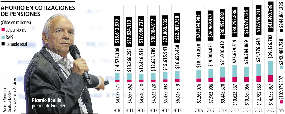“En términos del PIB, representa, en promedio, para todos los 13 años, 3% del PIB, pero en el año 2022 significó 4,4% del PIB. En 2022, Colpensiones recaudo $14,4 billones y los cuatro fondos privados $29 billones, para un total de $43,5 billones, eso es 4% del PIB”, complementó.