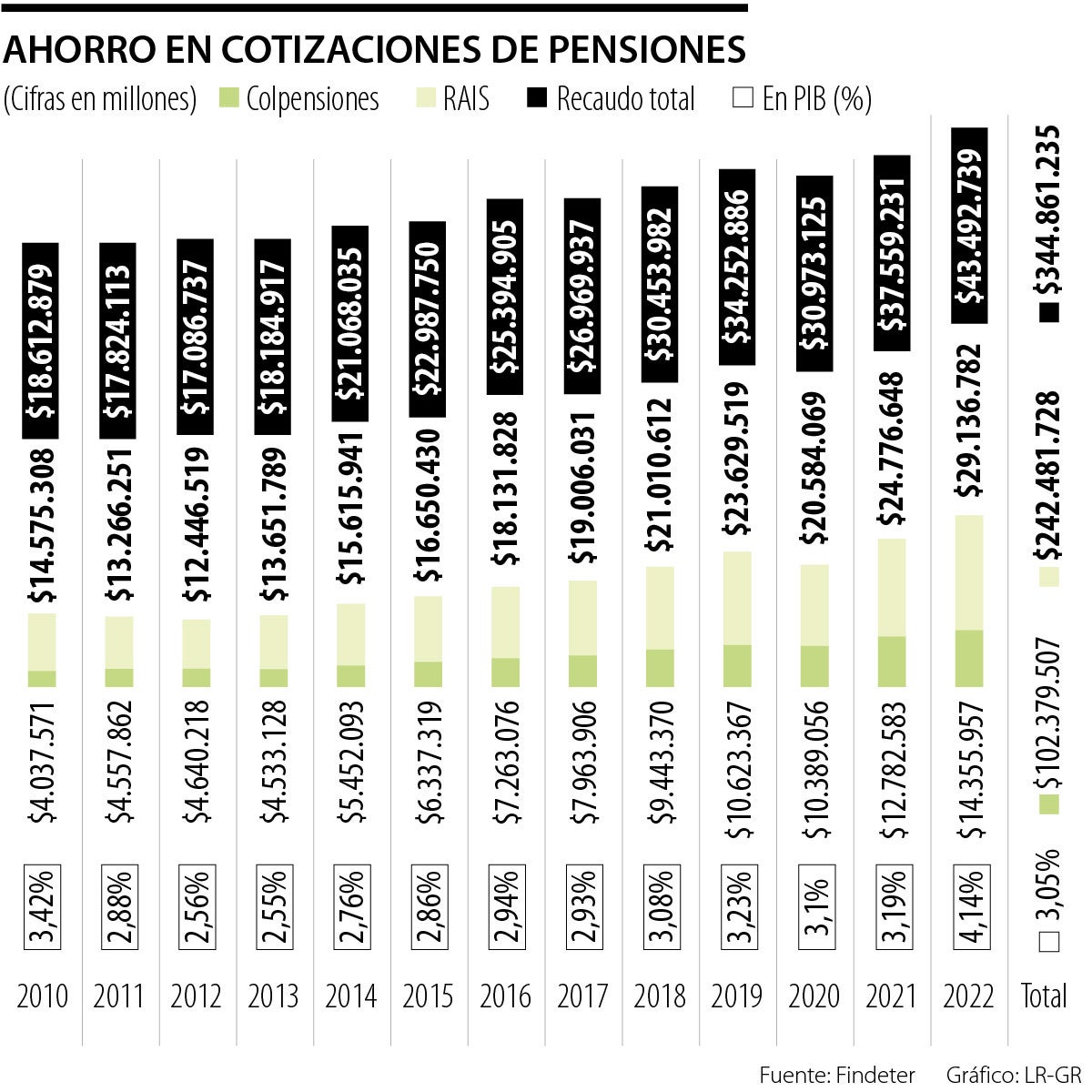El directivo explicó, además, cómo se ha comportado el ahorro acumulado de los últimos 13 años. "En enero de 2010, a 31 de diciembre de 2022, en Colpensiones se han recaudo $102 billones, y en los cuatro fondos privados se han recaudado $242 billones: en total, en los 13 años, se han recaudado $344 billones; ese es el ahorro del país", describe.