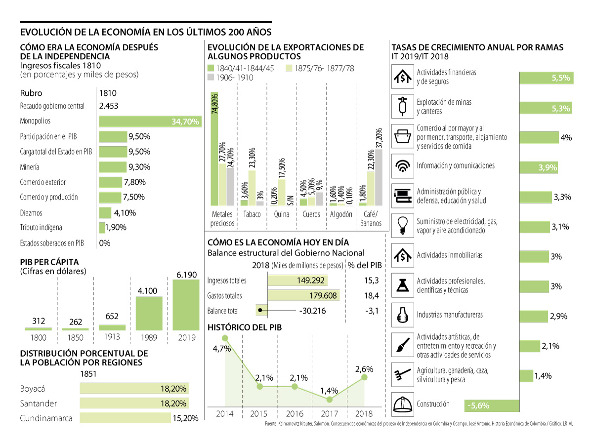 “En las primeras etapas de la República, la economía era agraria muy tradicional y había una escasa conexión entre las muy diversas regiones del país. Como en la Colonia, el principal producto de exportación era el oro, aunque con un gradual aumento de la producción en Antioquia y un retroceso del Pacífico colombiano. El crecimiento económico durante la primera década del siglo XIX fue, sin embargo, muy lento”, manifestó el codirector del Banco de la República, José A. Ocampo.