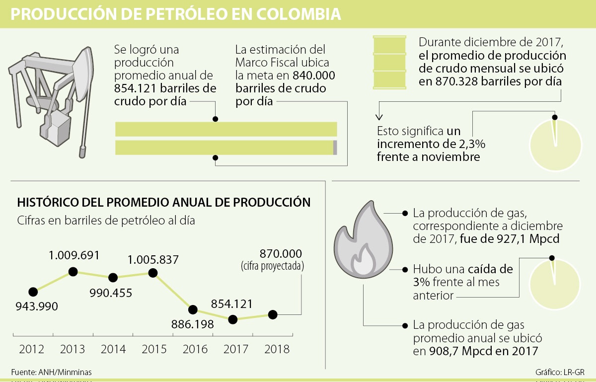 El Ministerio de Minas y Energía dio a conocer que al cierre de 2017 la producción petrolera colombiana llegó a los 854.121 barriles diarios, es decir, una caída de 3,6%, si se compara con los 886.198 barriles al día producidos en promedio durante 2016. Una caída que, sin embargo, para los analistas habla de la recuperación del sector y la estabilidad que viene demotrando la industria.
