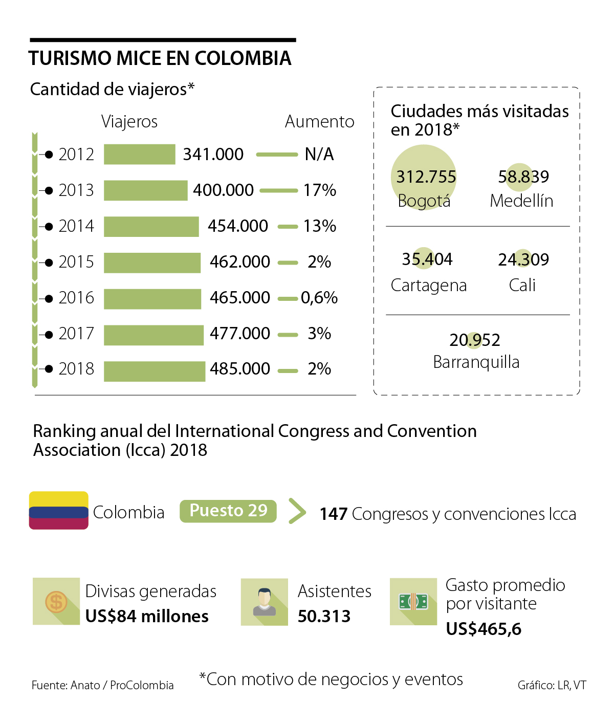 De acuerdo con datos calculados por la Asociación Colombiana de Agencias de Viajes y Turismo (Anato), con base en las cifras de Migración Colombia, el año pasado ingresaron al país 485.000 viajeros con motivo de negocios, 2% más de los ingresos reportados en 2017.
