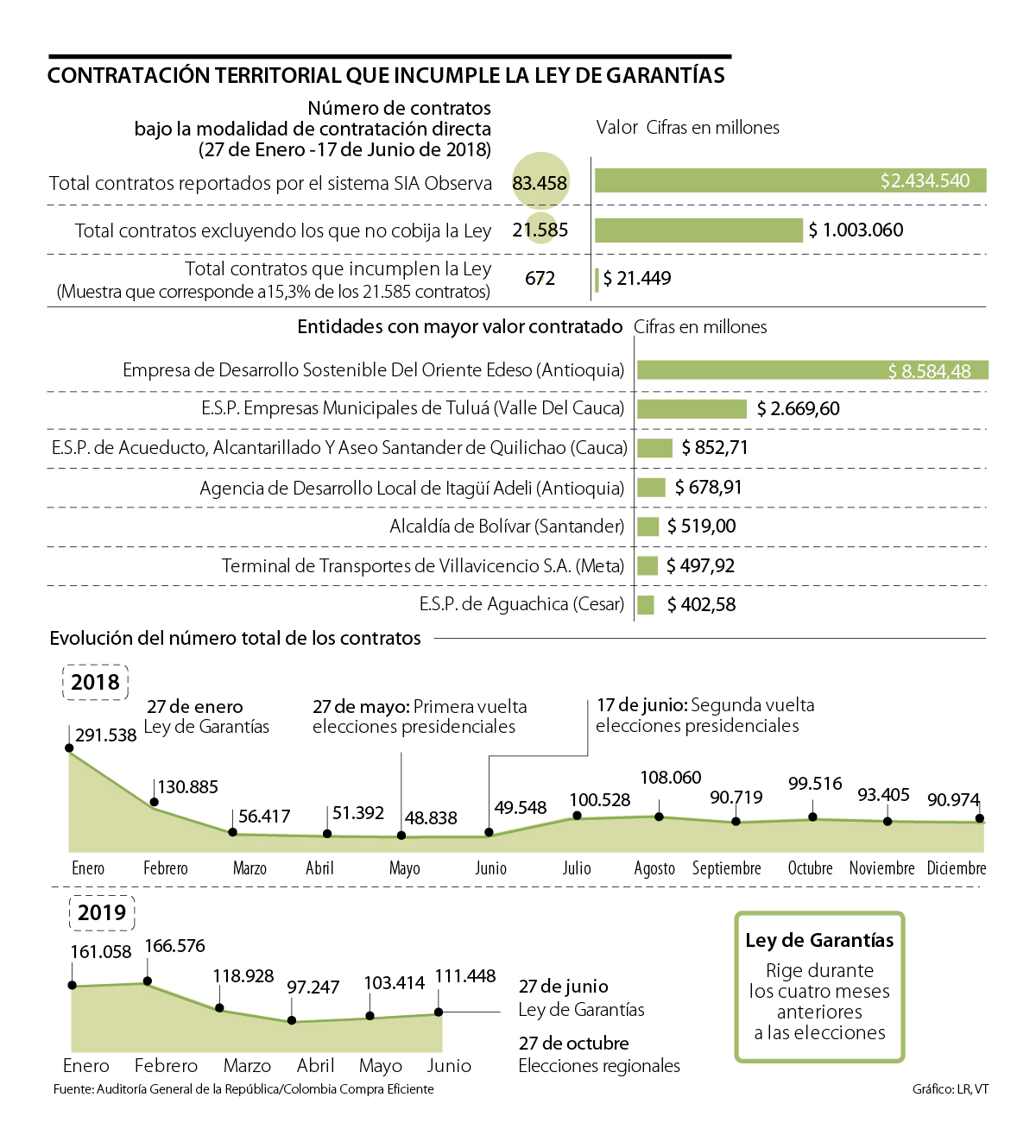 A pesar de que la Ley de Garantías prohíbe la contratación directa durante los cuatro meses anteriores a unas elecciones, la Auditoría General de la República reveló que varias entidades territoriales incumplieron esta norma en las presidenciales de 2018, en las que venció el ya hoy mandatario Iván Duque con 53,98% de los votos.